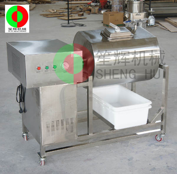 3、滾揉時間到后,滾筒將會自動停止,并保持筒內(nèi)為真空狀態(tài)并繼續(xù)計時,直至設(shè)定的靜置時間到,發(fā)出報警信號,提示操作人員可以開蓋取出桶內(nèi)的物料。此時按下消真空按鈕就可消去真空,這時可卸掉筒蓋,接著按下卸料按鈕,滾筒即按出料運轉(zhuǎn)方向(順時針方向)旋轉(zhuǎn),從而將肉料自行送出,落入接在筒口下面的肉車等容器內(nèi),完成了整個工藝流程。